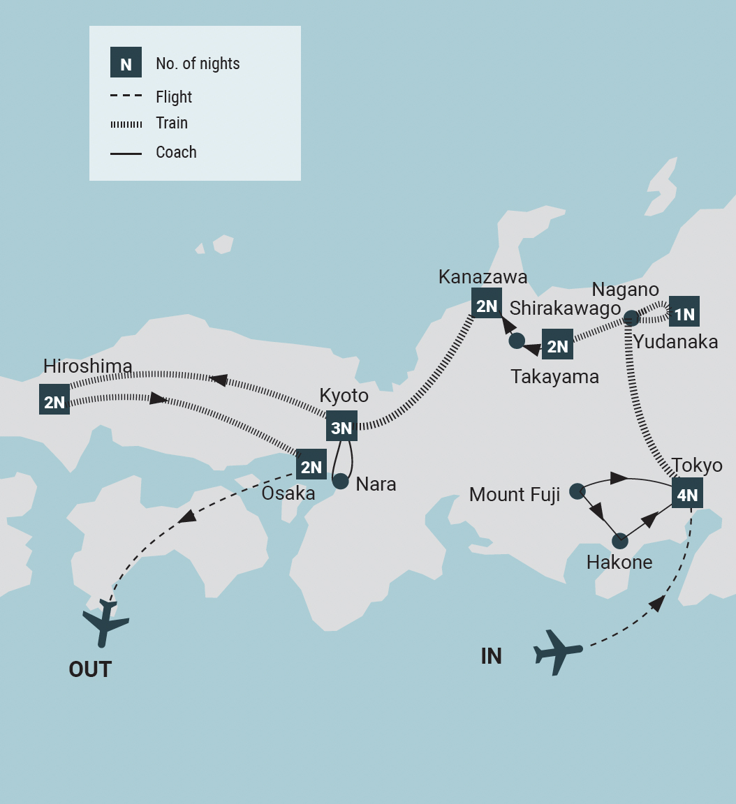 Tokyo>Mount Fuji>Hakone>Yudanaka>Takayama>Shirakawago>Kanazawa>Kyoto>Mount Koya> Hiroshima & Osaka